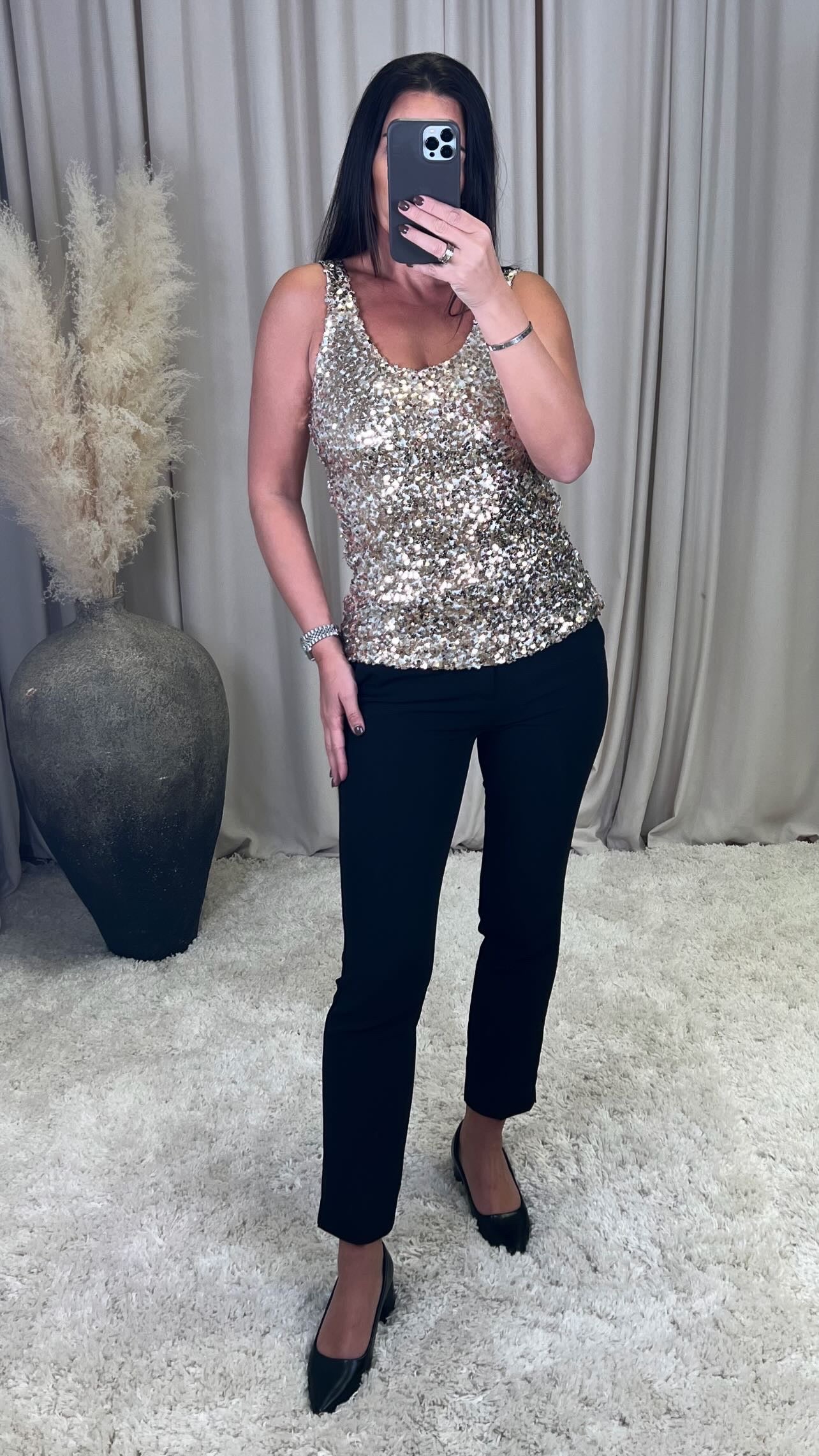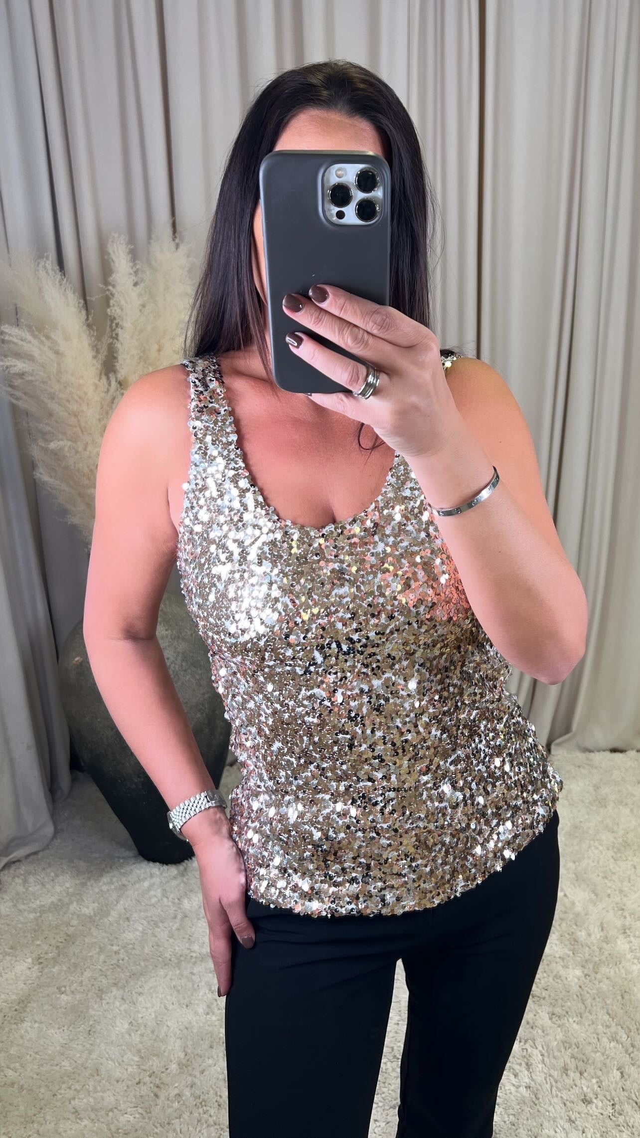 Æðislegur pallíettuhlýrabolur með mjúku efni undir svo pallíetturnar stingi ekki. Hlýrarnir eru með pallíettum.