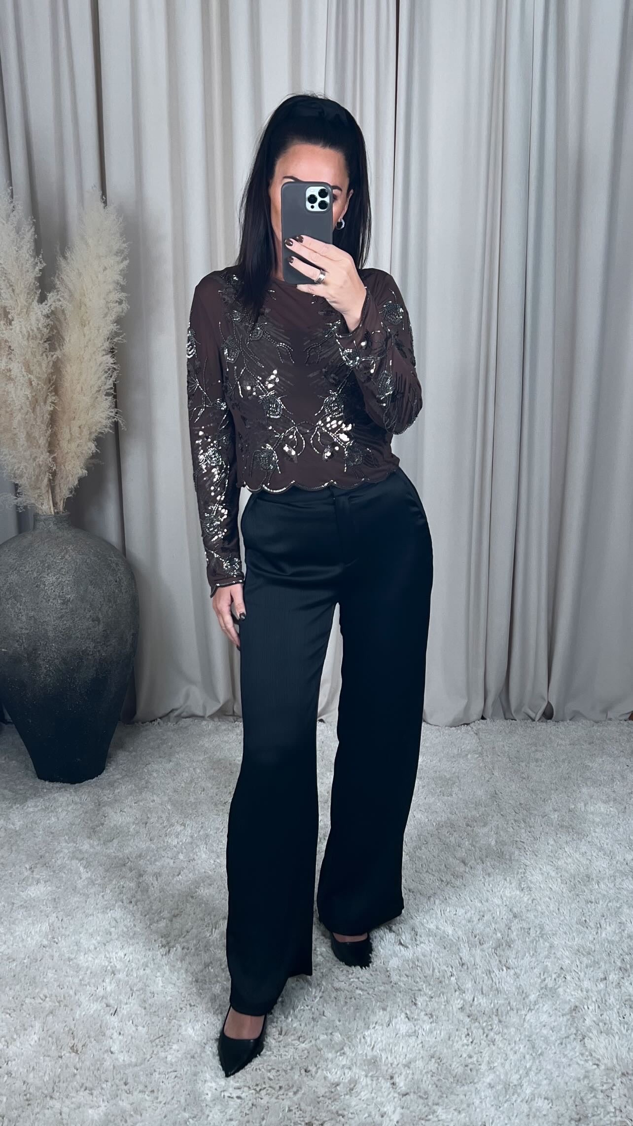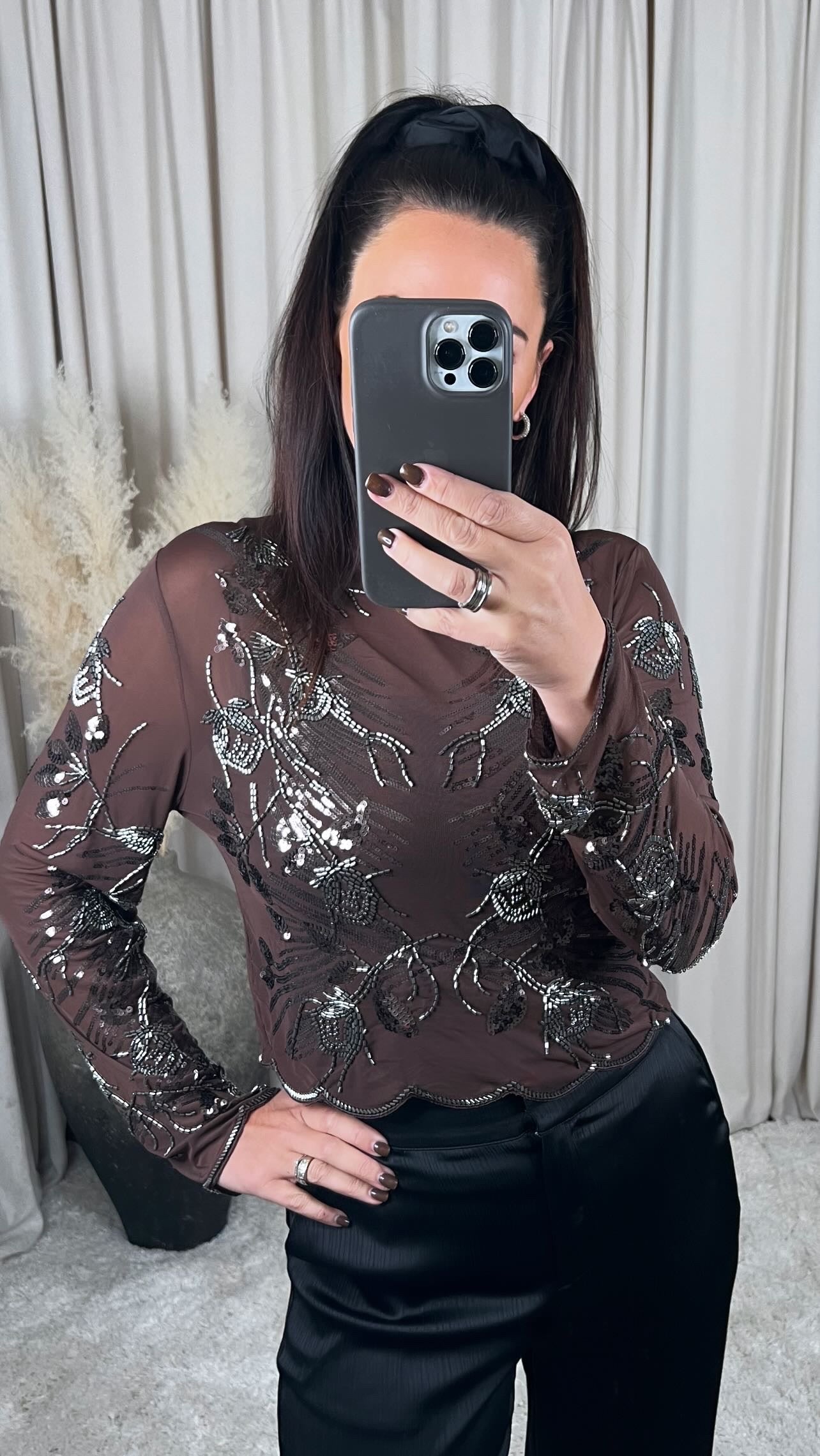 Mjög fallegur mesh bolur með virkilega fallegu pallíettu munstri. Það er mjög góð teygja í efninu.