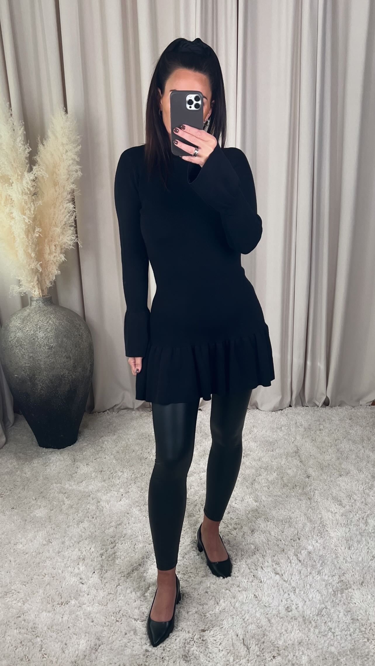 Flottur peysukjóll með pífu neðst og neðst á ermum. Þetta er ein stærð og myndi henta ca 34-38/40