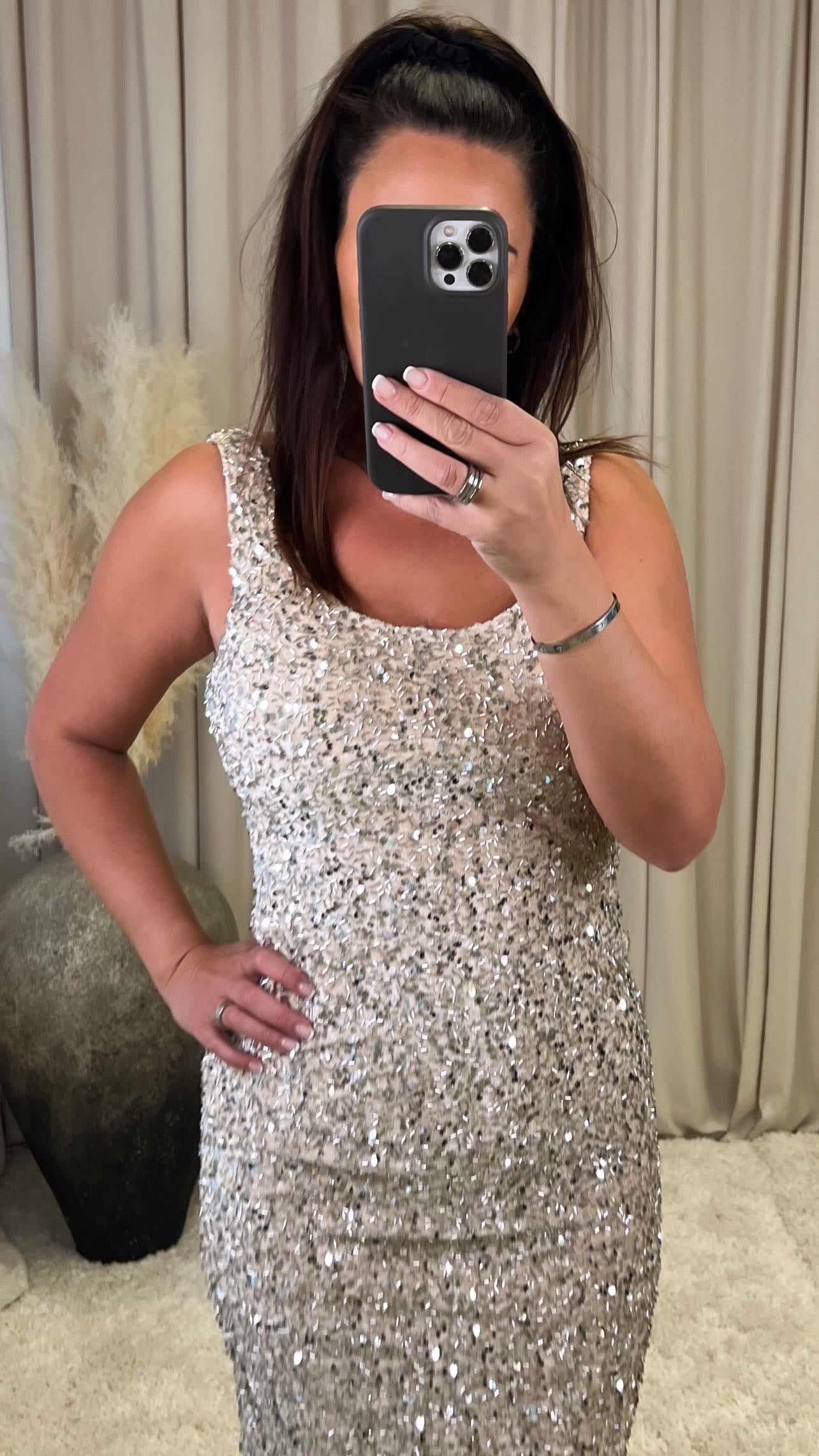 Glæsilegur pallíettukjóll sem nær fyrir neðan hné. Það er undirkjóll sem kemur í veg fyrir að pallíetturnar meiði mann