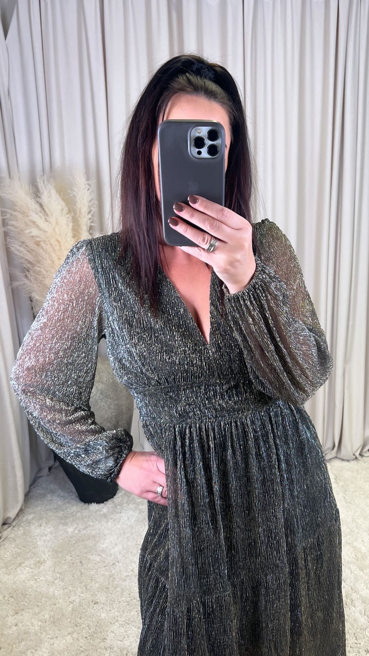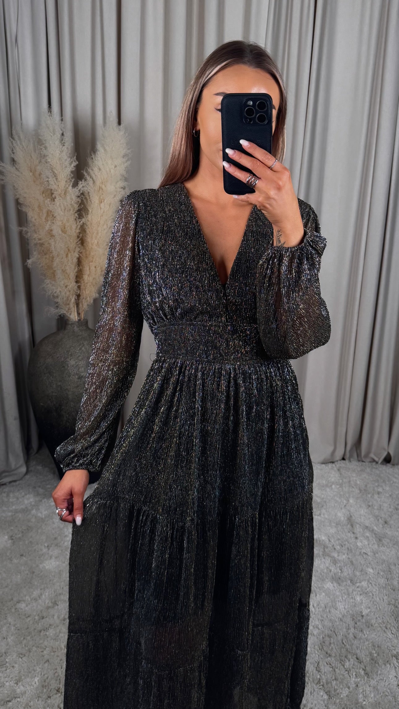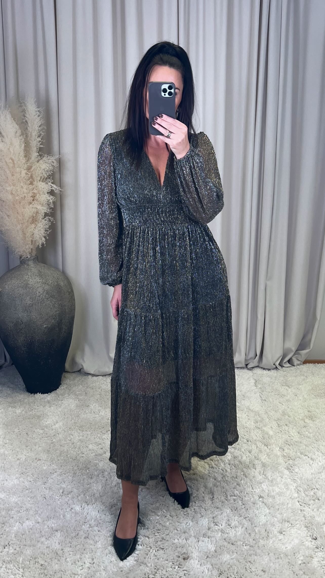 Fallegur skósíður kjóll með gull þráðum í. Það er góð teygja í bakið sem gerir kjólinn mjög klæðilegan og þægilegan!