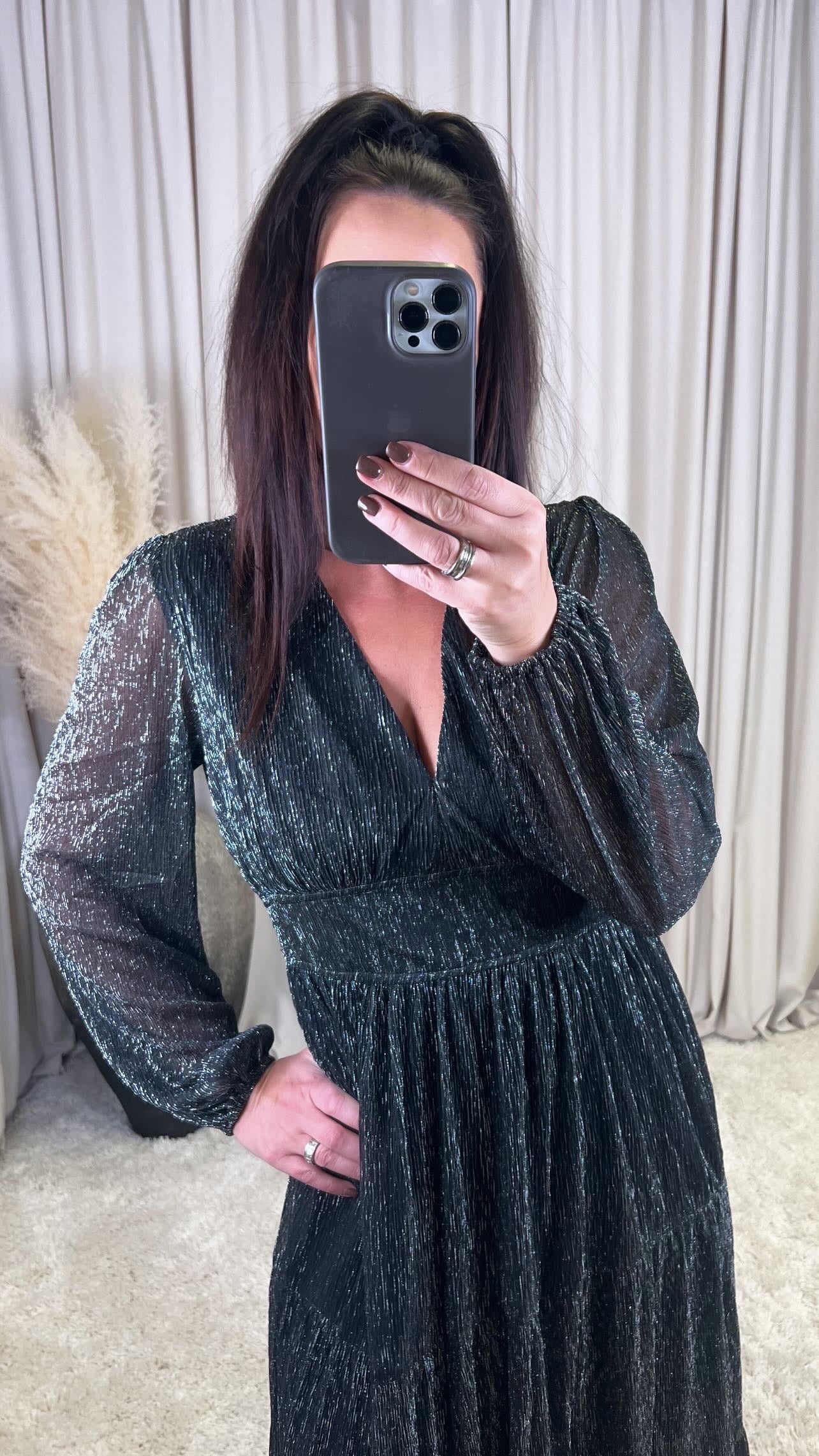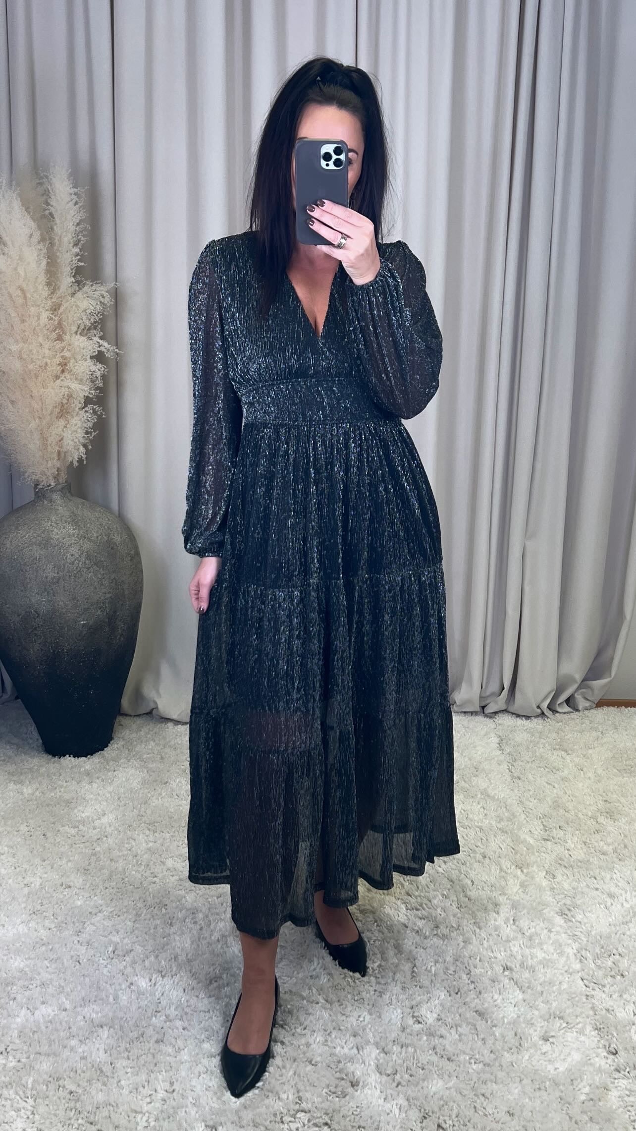 Fallegur skósíður kjóll með silfur þráðum í. Það er góð teygja í bakið sem gerir kjólinn mjög klæðilegan og þægilegan!