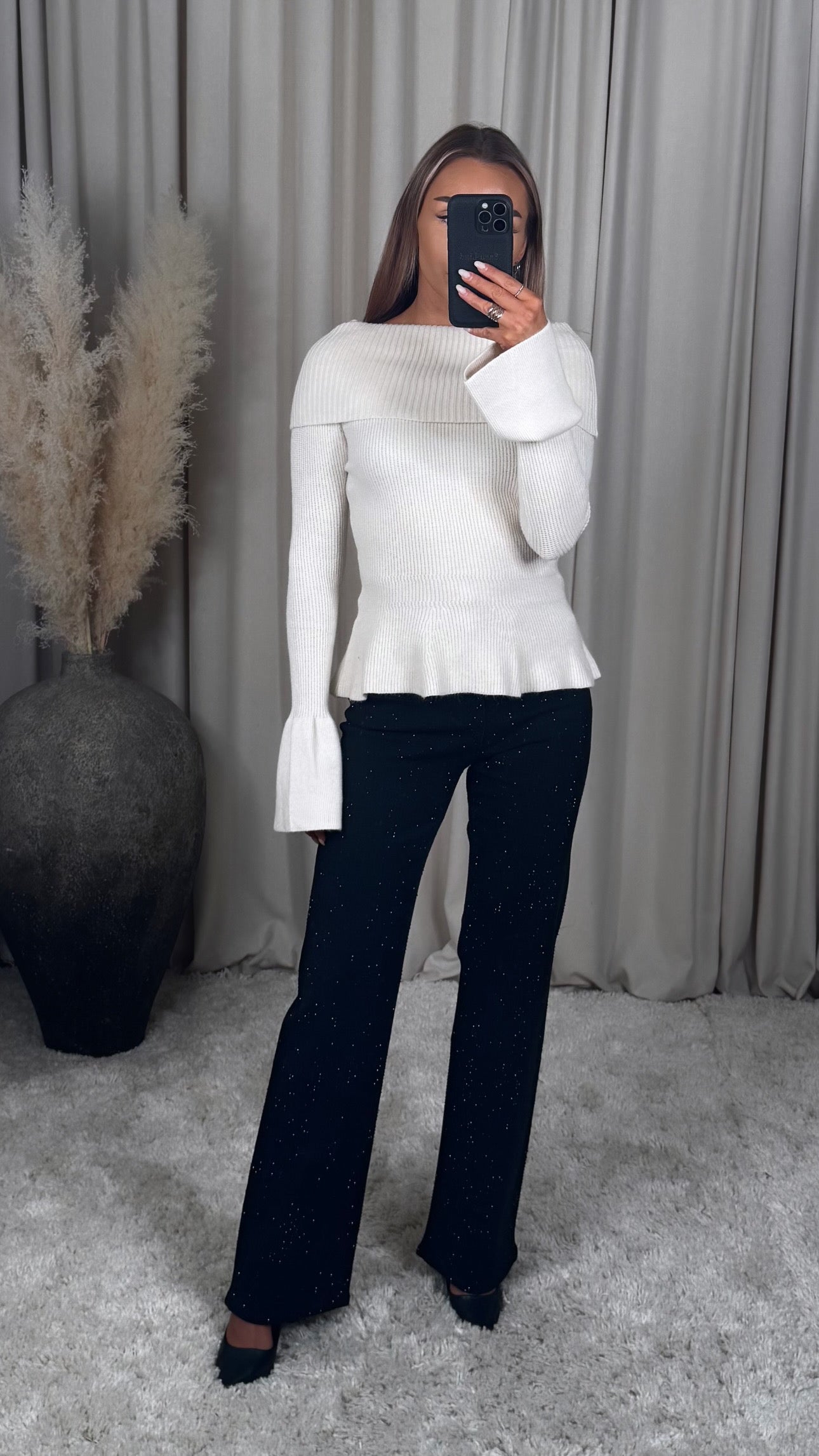 Falleg off shoulder peysa með útvíðum ermum. Mjög mjúkt og teygjanlegt efni í henni!