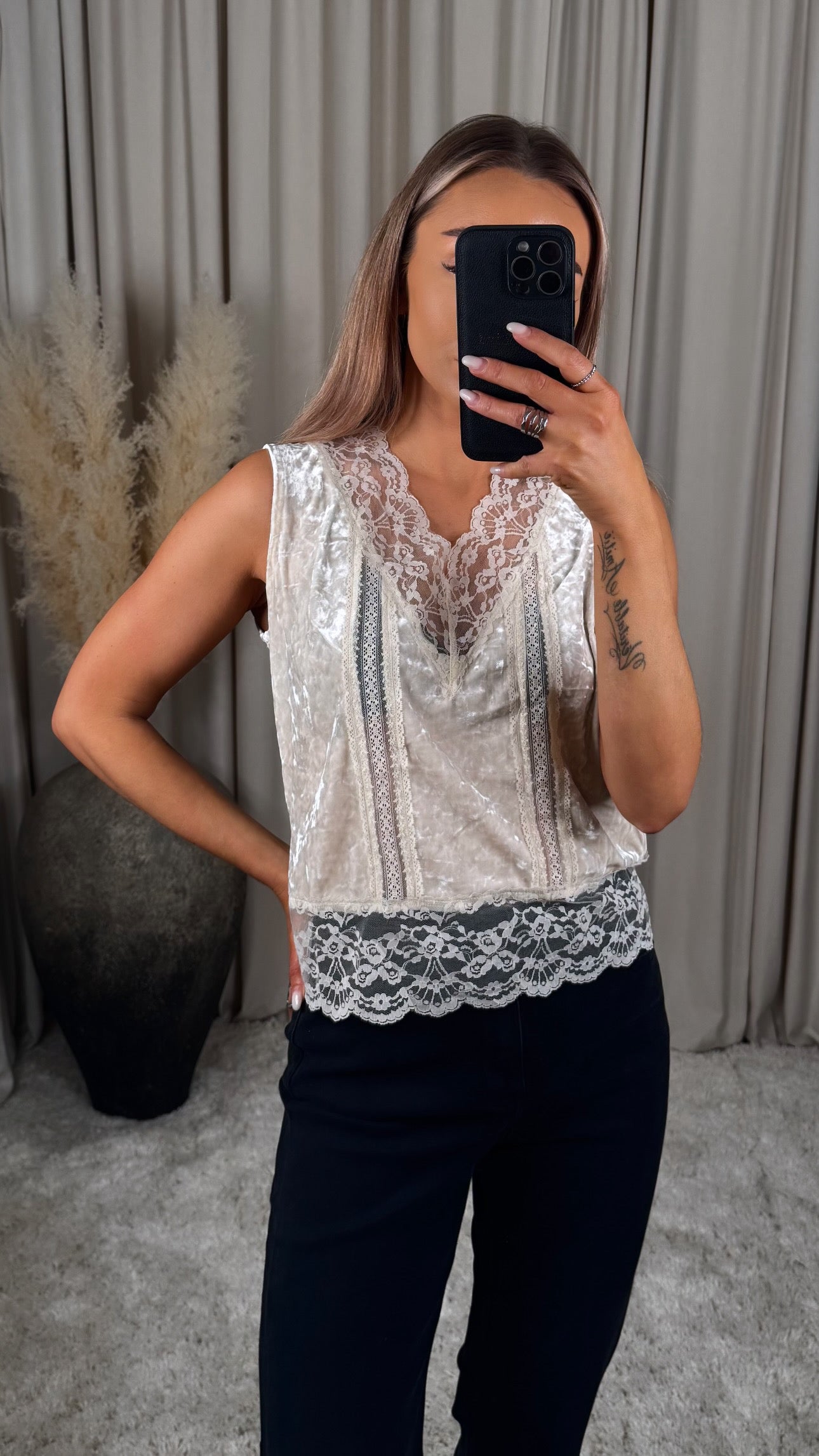Fallegur mjúkur velour bolur með blúndu. Góð teygja í efninu og er bolurinn fullkomin innan undir jakka eða einn og sér!