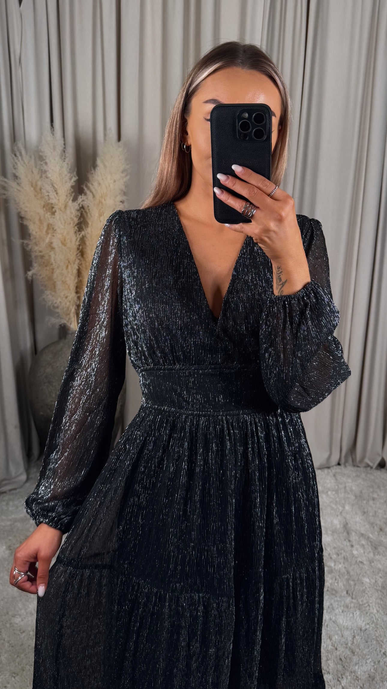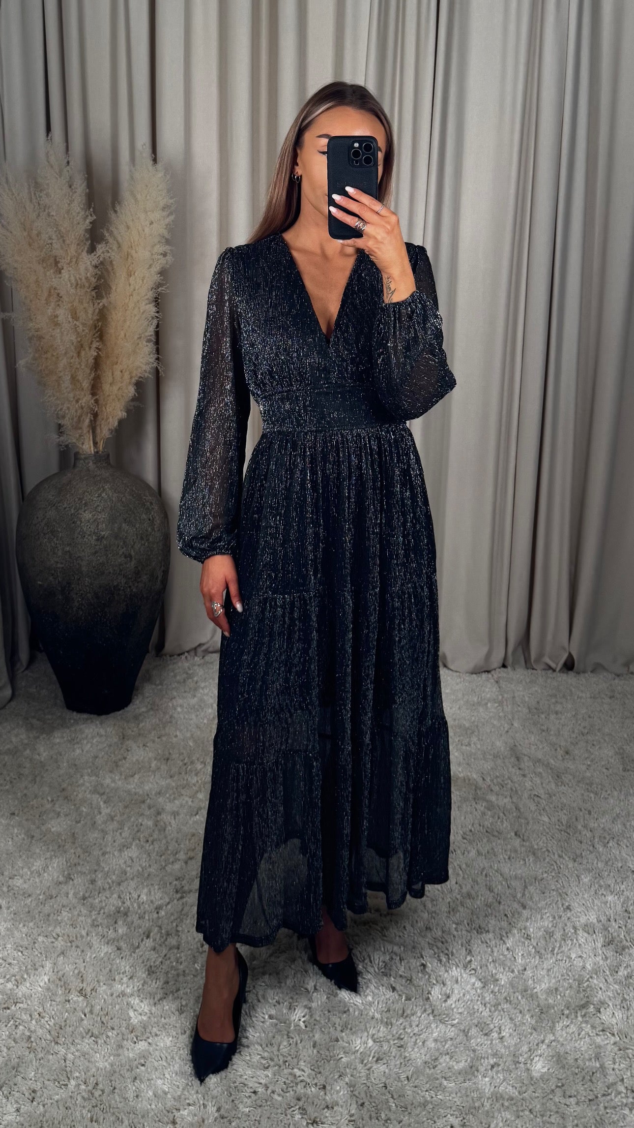 Fallegur skósíður kjóll með silfur þráðum í. Það er góð teygja í bakið sem gerir kjólinn mjög klæðilegan og þægilegan!
