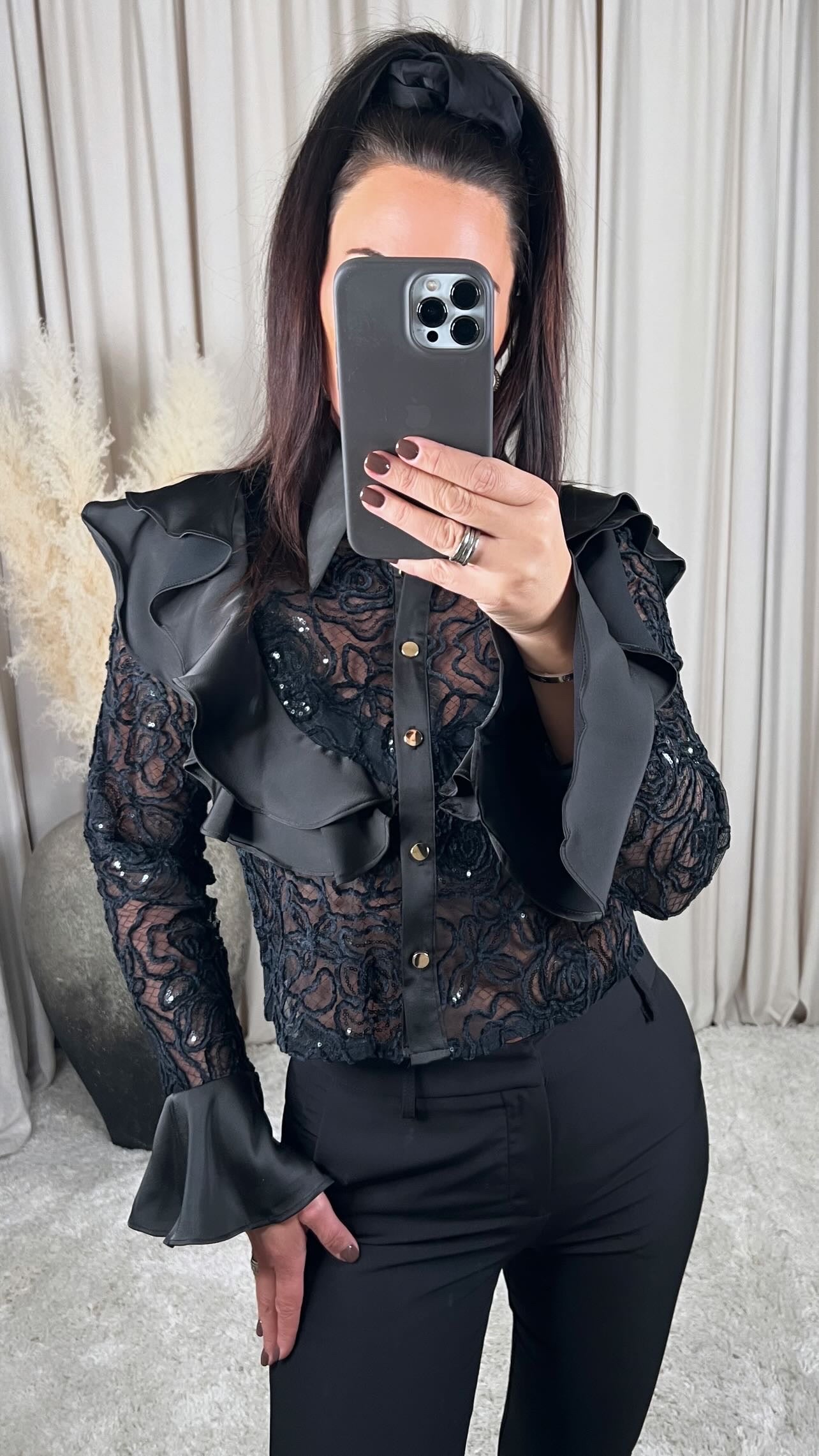 Falleg skyrta með kraga og hneppum kemur með blúndu, pallíettum og pífum.